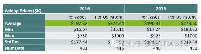 2016年每个美国专利的卖主索价(asking prices)与去年基本持平,为27.1万美金;