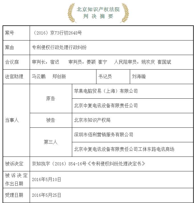 原告苹果电脑贸易(上海)有限公司(简称苹果上海公司)、北京中复电讯设备有限责任公司(简称中复公司)不服被告北京市知识产权局(简称北知局)于2016年5月10日作出的京知执字(2016)854-16号《专利侵权纠纷处理决定书》(简称被诉决定),在法定期限内向本院提起行政诉讼。本院于2016年5月25日受理后,依法组成合议庭,并通知与本案存在利害关系的深圳市佰利营销服务有限公司(简称佰利公司)、北京中复电讯设备有限责任公司工体东路电讯商场(简称中复公司工体商场)作为第三人参加诉讼,于2016年12月7日公开开庭进行了审理。原告苹果上海公司的委托代理人杨璞、宋鹤,原告中复公司和第三人中复公司工体商场的委托代理人袁林、邓德学,被告北知局的委托代理人潘新胜、陈健,第三人佰利公司的委托代理人杨安进、徐永浩到庭参加了诉讼。本案现已审理终结。?