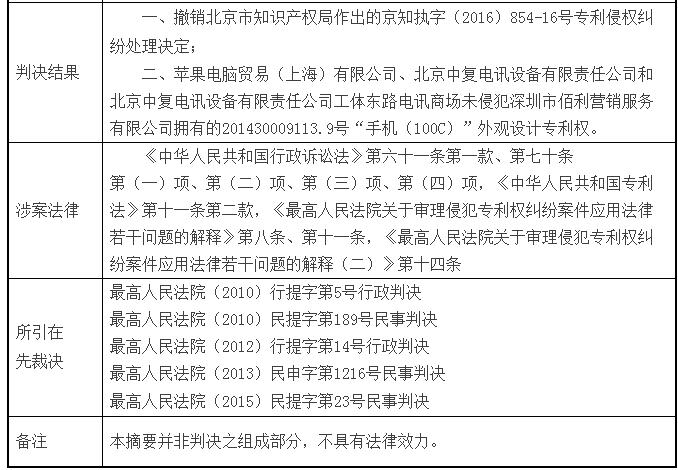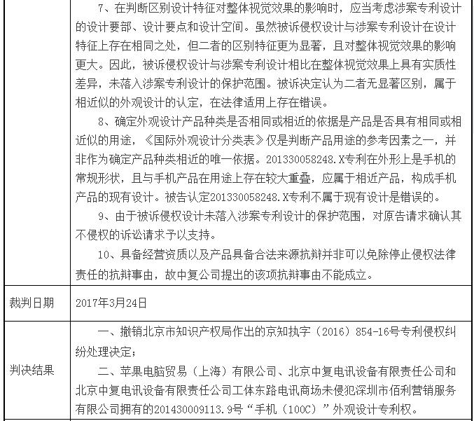 综上,中复公司及中复公司工体商场为生产经营目的许诺销售和销售、苹果上海公司销售被控侵权产品的行为侵犯了佰利公司的外观设计专利权。北知局作出被诉决定,责令中复公司及中复公司工体商场停止许诺销售和销售被控侵权产品,苹果上海公司停止销售被控侵权产品。