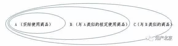 就商标禁用权而言,两种作法的不同则主要受制于2001年商标法第二十八条(2014年商标法第三十条)的规定。依据该规定,在后商标如与他人在先初步审定或在先注册的商标属于同一种或类似商品上注册的相同或相近似的商标,则在后商标将不会被核准注册。该规定意味着,如采用前一种作法,则原告可禁止他人注册的范围将包括与该实际使用商品构成同一种类的商品(即下图中的A部分)以及相类似的商品(即下图中的B部分,以及其他与实际使用商品相类似的商品)。但如果采用后一种作法,则原告可禁止他人注册的范围不仅限于与实际使用商品构成同一种或类似的商品,亦会延及与该“相类似的核定使用商品”构成“类似”的商品(即下图中的C部分)。