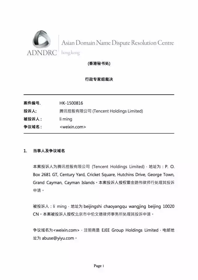 3000万打水漂,weixin.com域名被腾讯夺回?(附仲裁全文)