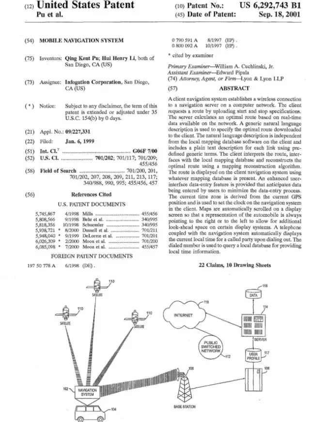 此次涉案专利US6292743,是关于“移动导航定位系统”,于1999年1月6日向美国专利商标局提交了专利申请,2001年9月18日获得授权。目前,由于这件专利都有在中国提交专利申请CN00802563.0 ,也有同族专利,因此笔者担心该公司到中国提起相关专利诉讼。