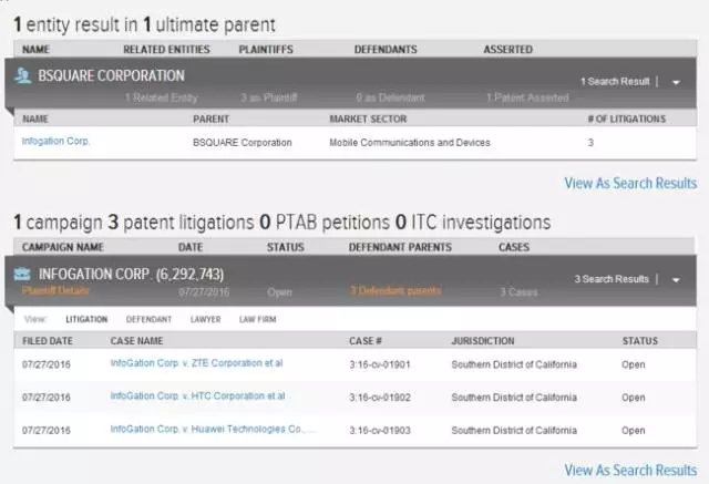 从美国加州南区法院的记录,美国圣地亚哥的Infogation公司起诉了3家亚洲公司侵犯了它的专利,其被告公司中有来自中国大陆的华为公司和中兴公司,以及来自中国台湾的HTC公司。从时间上来看,被告公司可能还没有收到法院通知。代理Infogation公司出庭的是美国两家著名的专利诉讼事务所美国华盛顿的SMITH, GARELL & RUSSELL和圣地亚哥的KIRBY & KIRBY。