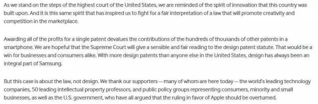 听证会后第一时间,三星在官方发表声明称:“希望联邦最高法院能够给出一个对设计专利法条公平合理的解释?!?截图如下: