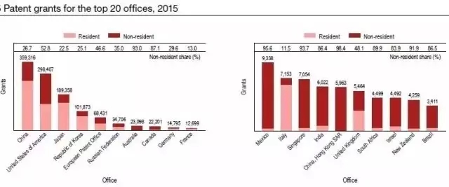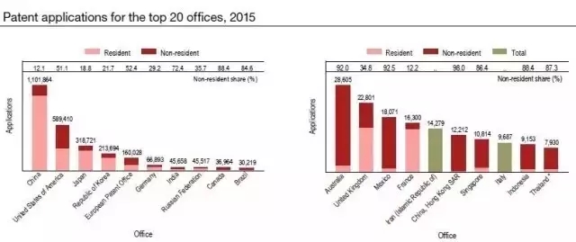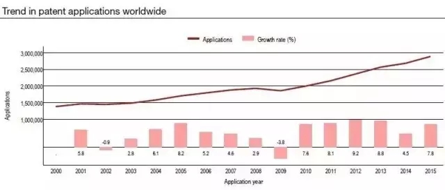 2015年,创新者在全世界提交的专利申请总计约为290万件,比2014年增长7.8%,高于2014年4.5%的增长率。中国专利局2015年受理了1,101,864件申请,这些申请包括来自中国居民的申请,也包括海外创新者在中国寻求专利保护的申请。?