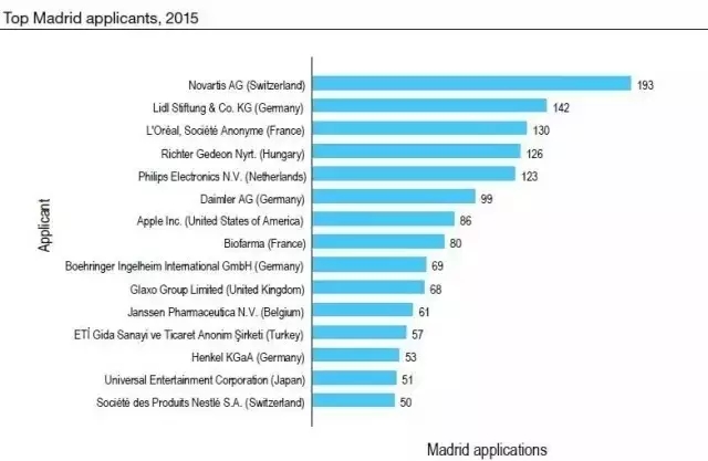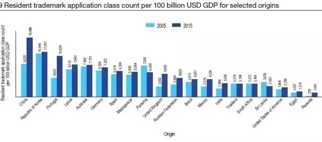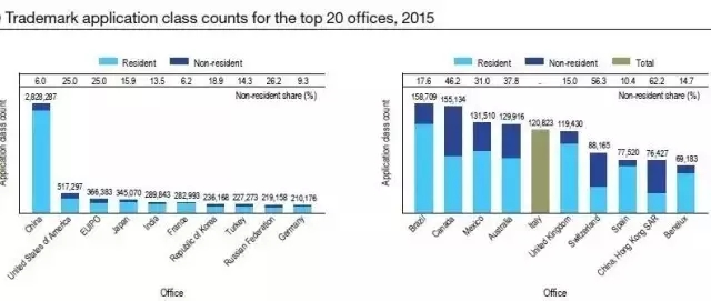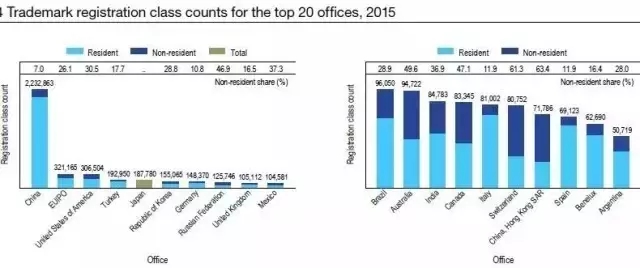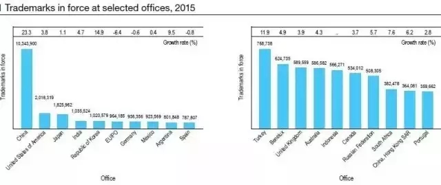 2015年,中国出现了迄今最多的商标申请活动,按类计为283万。其次是美国(517,297)、欧洲联盟知识产权局(EUIPO;366,383)、日本(345,070)和印度(289,843)。2015年商标申请增长率为两位数的有:日本(+43%)、意大利(+32.6%)、中国(+27.4%)、印度(+21.9%)和韩国(+13.9%)。全球商标申请活动的78%为本国居民在其本国进行申请。