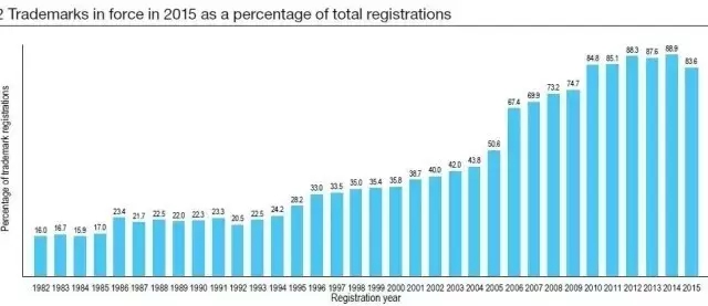 跟专利固定的保护期限不同,商标在有效期届满前可以通过办理续展手续而继续有效。据估计,2015年全球的有效商标为3,650万件,比2014年增长8.5%。其中国占总数的28.3%。