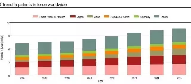 2015年全世界共授权约124万件专利,比2014年增长了5.2%,是2012年以来最快的增长率。?