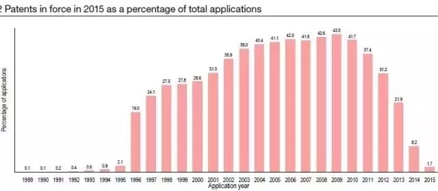 2015年有效专利占专利申请量的1.7%,这也体现出专利申请量的基数庞大。