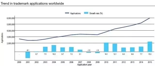 据估计,2015年全球商标申请共计600万件,按类计为840万,申请量增长了15.3%,是2000年以来的最高增长率。