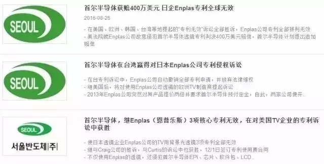 2016年,首尔半导体对日本透镜制造商Enplas的专利诉讼,判定Enplas故意侵权,获赔400万美元。刚开始,首尔半导体和Enplas的这场专利战打得难分难解,2013年Enplas曾试图起诉首尔半导体背光透镜专利无效开始。随后,首尔半导体发起了多次反击,最终才被美联邦法院判决Enplas公司故意侵权,支付首尔半导体专利使用费400万美金。
