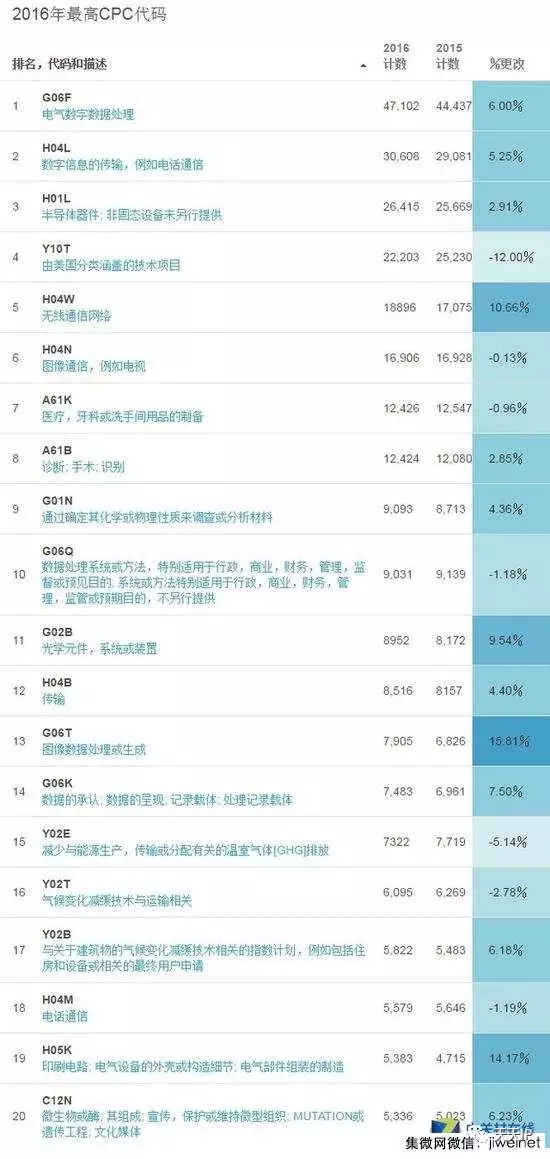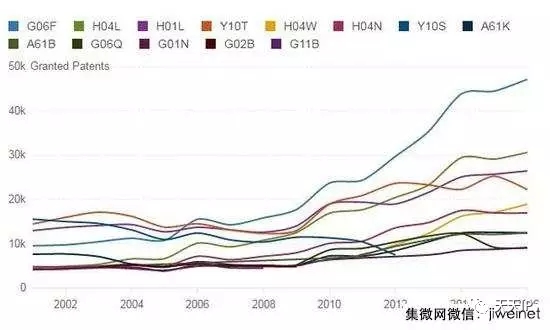 2016年在大多数技术领域的增长。共同专利分类号H04W(无线通信网络)增加了近10%。商业专利从2014年开始大幅下降持续到2015年。