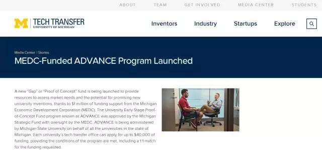 更多 >>2017年4月,美国密歇根经济发展公司(MEDC)投资100万美元设立了名为ADVANCE计划的早期概念证明基金,用于评估市场需求和大学发明的商业化潜力。密歇根州立大学代表州内所有大学管理该计划。?