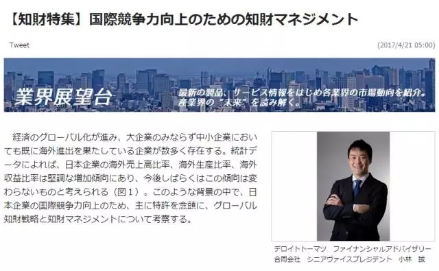 更多 >>随着经济全球化的推进,日本大、中、小企业纷纷进军海外。据统计,日企产品的海外销售比例、海外生产比例、海外收益比例都呈现出强劲的上升趋势。为提高日企的国际竞争力,日本德勤金融咨询有限责任公司的高级副总裁小林诚针对全球知识产权战略及管理进行了考察,并提出相关建议。