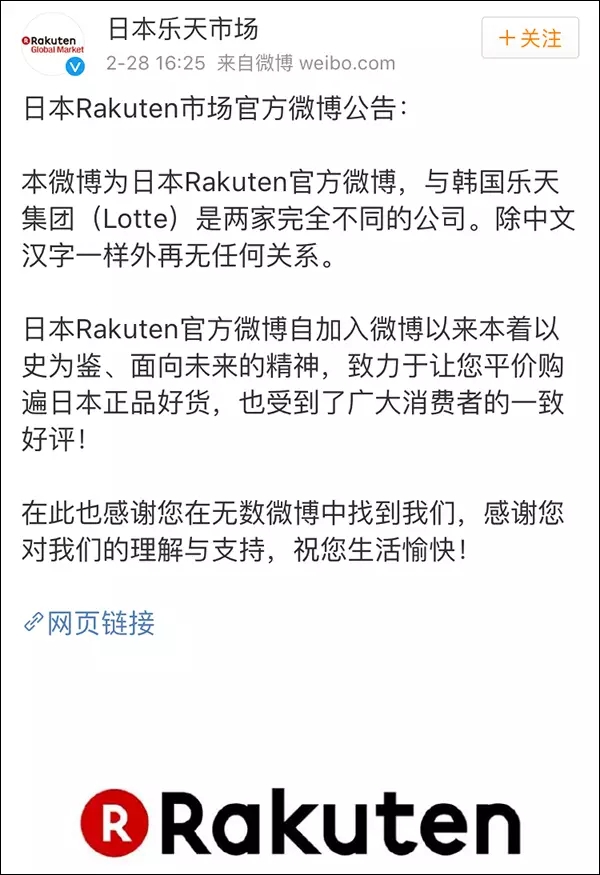 对此,28日下午,@日本乐天市场发布微博公告,称@日本乐天市场为日本Rakuten官方微博,与韩国乐天集团(Lotte)是两家完全不同的公司,只是中文汉字一样,此外再无任何关系。