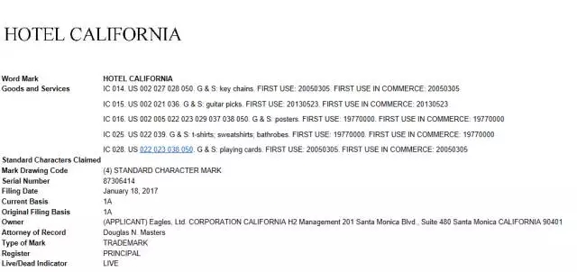 事实上,老鹰乐队“Hotel California”商标注册申请(87/306,414)目前还在进行中。目前,从美国专利商标局(USPTO)数据库查询到的结果显示,该商标申请于2017年1月18日,申请注册的商品服务类别包括第14类(钥匙链)、第15类(吉他拨片)、第16类(海报)、第25类(T恤、长袖运动衫、浴衣)、第28类(纸牌)。