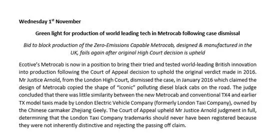 该起纠纷源自伦敦出租车公司以假冒和侵犯两件黑色出租车形状的立体商标为由,将新型环保出租车Metrocab的生产企业Frazer-Nash Research诉至法院。