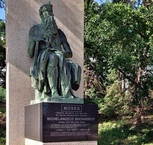 ??????? 这座为Fisher带来麻烦的雕像是一尊全尺寸青铜铸造的米开朗基罗雕塑作品摩西(Moses),它与该学校的另外一尊同样是米开朗基罗的作品大卫(David)都是20世纪初当地一位发明家捐赠给Sioux Falls市和Augustana学院的。