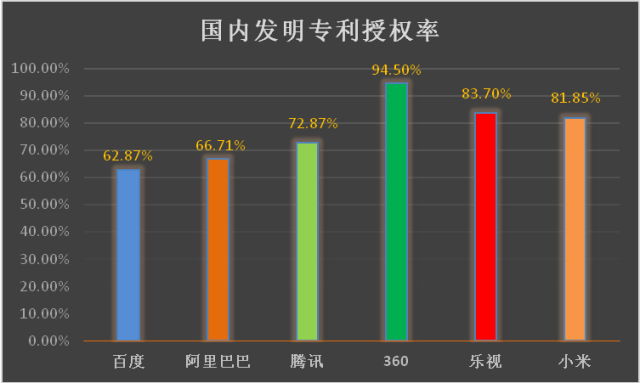 授权率方面,互联网企业的发明专利授权率总体较高,均高于60%。BAT的发明专利授权率约70%左右,而小米360乐视的发明专利授权率达到80%以上。其中, 360以94.50%远远高于其他互公司,乐视(83.70%)和小米(81.85%)分列第二、第三。360在专利撰写方面也具有领先优势,其权利要求项数位居六家公司之首。?
