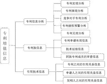 专利增值信息是指以专利基础信息为主要依据,经过加工、标引、统计、分析、整合、转化等手段,基于特定的目的而得到的相关专利信息。主要包括专利的主要技术信息的提炼,专利申请趋势、主要申请人、主要发明人、同族专利等信息,如图2所示: