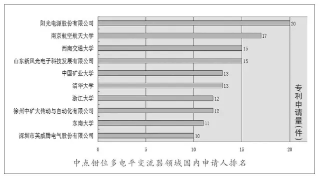 在该领域的中国专利申请中,申请人主要为高校及科研机构。这表明我国对中点钳位多电平变流器技术的研究多为学术研究性质,其产业化程度还不高。其中,阳光电源股份有限公司、南京航空航天大学、西南交通大学,以及山东新风光电子科技发展有限公司等构成目前中点钳位多电平变流器领域中国专利申请的主力(见下图)。国内电力行业的企业、科研机构和一些高校近年来在该领域进行了大量研发,技术优势较为明显。