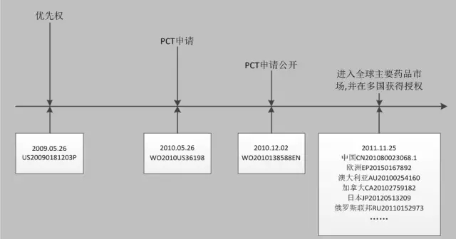 橘皮书(Orange Book)披露了Venetoclax的核心专利,其包括化合物核心专利US8546399(B2)和治疗方法核心专利US9174982(B2)。其中,化合物核心专利采用巴黎公约和PCT申请两种方式在全球32个国家/地区进行申请,为其在全球多个国家/地区上市做好了充足的准备。