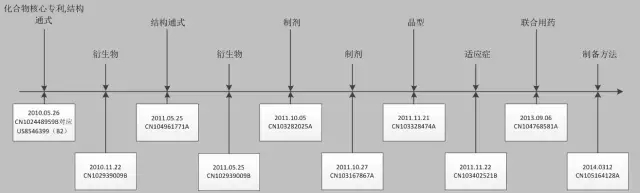 除了广泛的地域布局之外,在Venetoclax的化合物核心专利的基础上,Abbott还对其进行了合理的技术布局。由于Abbott已在全球的主流药品市场对Venetoclax进行专利布局,在此仅以中国为例。