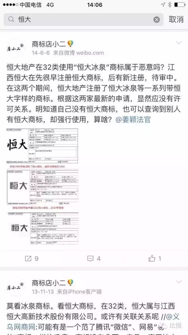翻翻档案,江西恒大32类“矿泉水等商品”的恒大商标被提起撤销是在2013年12月16日,还是棋差一招,晚于恒大冰泉面世一个月有余(暂不论差这一招有没有致命影响)。