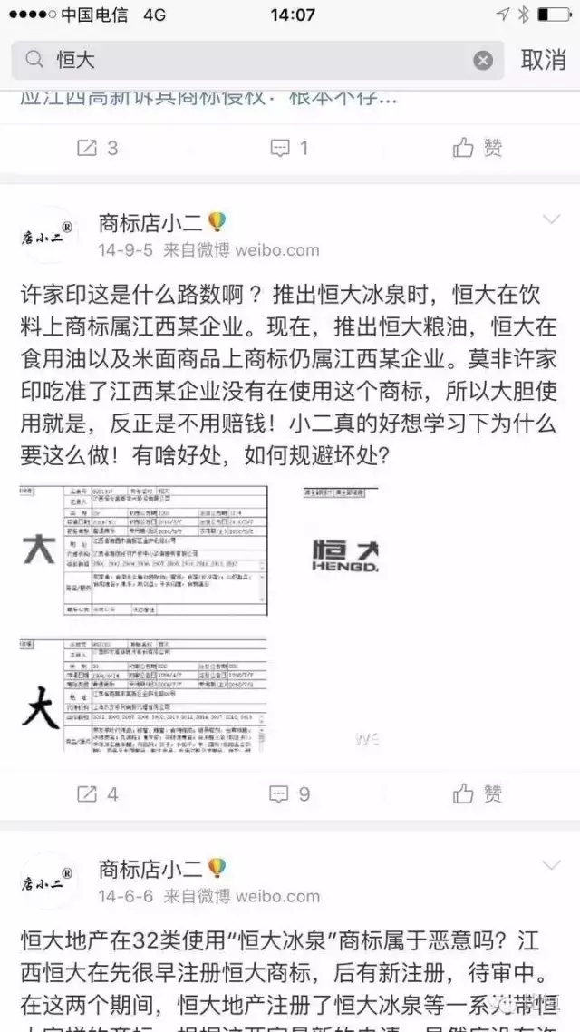 江西恒大在矿泉水、粮油、奶粉都已经在先注册商标时,多类?;?#xff0c;已经在相关的商品上核准注册了的恒大商标。中国恒大要用恒大商标做矿泉水、粮油、奶粉的生意,则必须踏着江西恒大的尸体上过去。江西恒大也不是吃素的,人家也是一个上市公司,一个上市公司,扩展业务还不是分分钟的事!果不其然,2014年6月,江西恒大矿泉水有限公司登记成立。