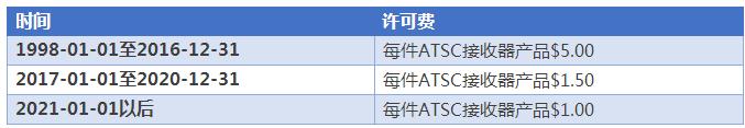 据海尔透露,ATSC标准在美国、加拿大、韩国、墨西哥等国家是地面、有线和卫星数字电视信号传输和解码强制标准。所以,在这些国家销售的电视必须采用ATSC标准必要专利以接收符合ATSC或兼容ATSC的数字电视信号。而MPEG-2标准则是ATSC标准的一个组成部分。海尔称,在ATSC许可中,仅许可了ATSC接收器产品,即电视调谐器,而MPEG LA收取许可费用的计算如下表所示: