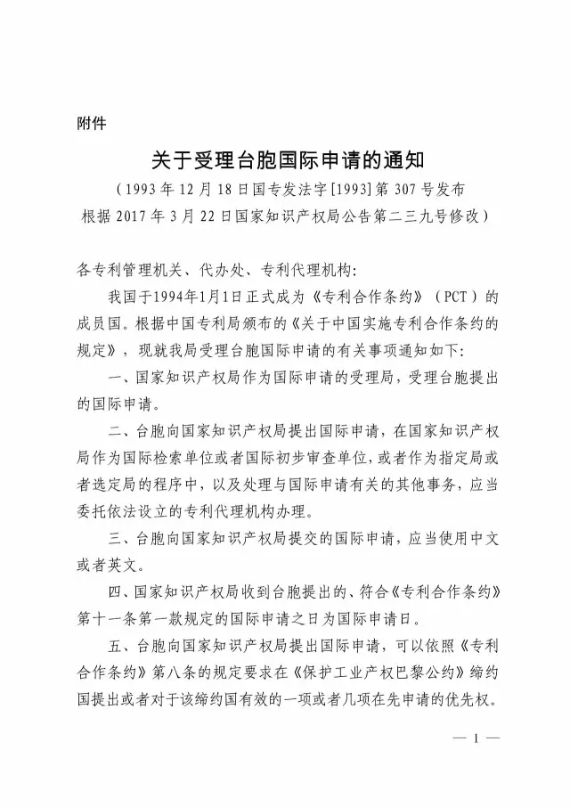 二、修改《关于受理台胞国际申请的通知》(国专发法字[1993] 第307号)