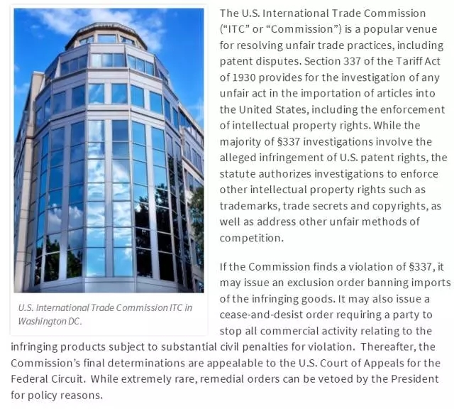 美国国际贸易委员会(International Trade Commission,ITC)致力于解决不公平的贸易竞争(例如专利纠纷),利用337调查避免进口产品侵犯美国知识产权。?