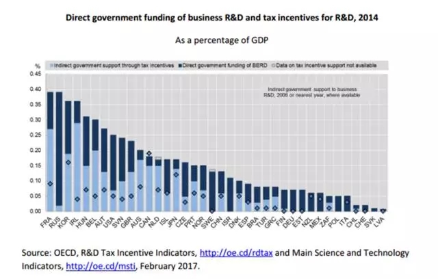 (6)研发税收激励的重要性逐渐显现。2016年35个OECD成员国中有29个(此外还有一些非成员国)出台了企业研发支出的税收优惠政策,这一数量稳步增长。政府支持的税收减免比例从2006年的37%增长到2014年的45%。2014年,约有6.4%的企业研发直接受政府资助。研发税收激励相当于在企业公共研发资助的基础上增加了5.3%。2014年,法国、俄罗斯、韩国为企业研发提供的综合性资助最多;美国、法国和中国税收减免力度最大。2014年,OECD成员国和其他重要经济体(巴西、中国、俄罗斯和南非)提供资助高达530亿美元,仅OECD成员国提供约420亿美元。企业研发强度与政府资助力度呈正相关。