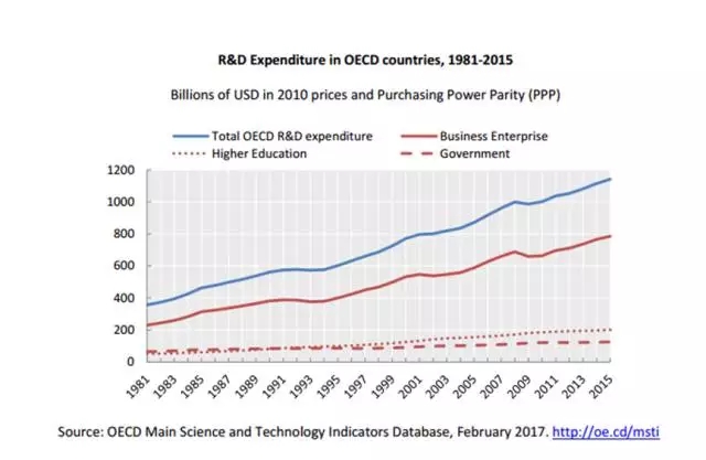 2017年2月7日,经济合作与发展组织(OECD)发布了“主要科学技术指标(2016)”(Main Science and Technology Indicators,MSTI)。研究发现政府研发经费近年来有所下降,企业研发是科学研究增长的重要驱动力。主要结论如下: