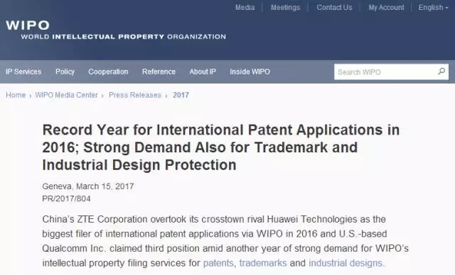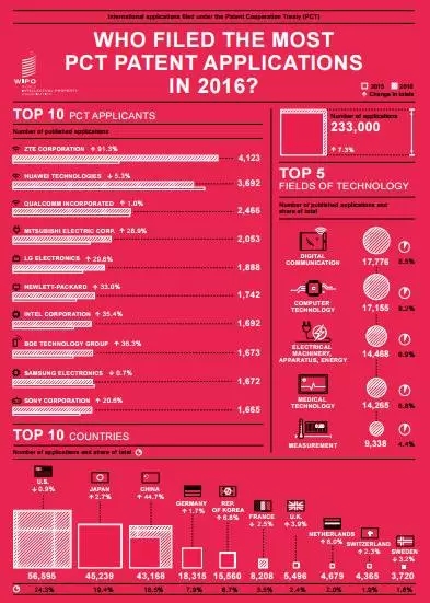 更多 >>2017年3月15日,世界知识产权组织(WIPO)发布了2016年全球知识产权活动报告。据WIPO统计,中国中兴通讯公司(ZIE,以下简称中兴)超过华为成为2016年PCT专利申请量最多的企业,美国高通公司位居第三。