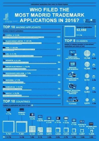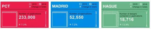 2016年,WIPO国际商标(马德里体系)申请量增长了7.2%,达52550件。WIPO海牙体系受理的工业品外观设计数量增长了13.9%(18716),这是WIPO三大申请体系连续第七年保持增长。?