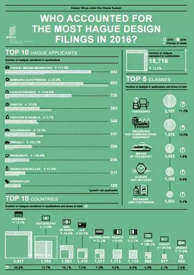 2016年,通过WIPO海牙体系申请国际工业品外观设计的申请共5562件,增长了35.3%,这些申请包含的外观设计数为18716项,增长了13.9%。?