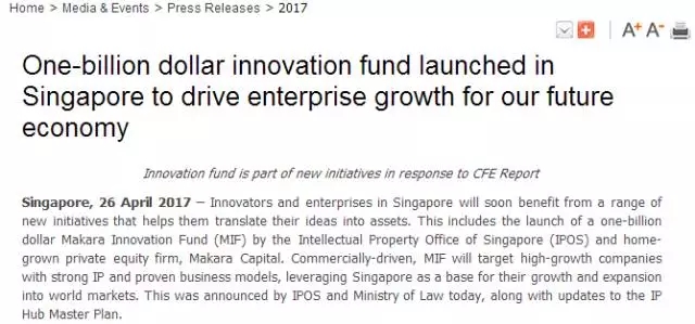 更多 >>2017年4月26日,新加坡知识产权局(IPOS)和本国私募投资公司Makara Capital联合发起价值10亿美元的创新基金(MIF)。?