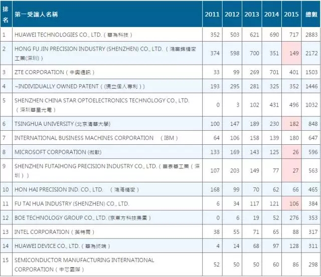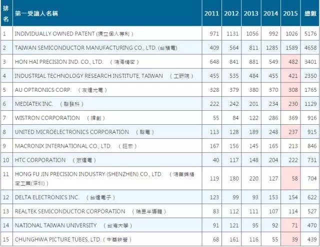 表2及表3分别为前15大之台湾专利权人及中国专利权人近5年美国专利获证数统计。表中2015年一栏红色底框之数据,为与2014年相比,呈下降趋势者,其中,前15大台湾专利权人中,呈下降趋势者有8名,占超过半数;而前15大中国专利权人中,呈下降趋势者只有5名,占三分之一。