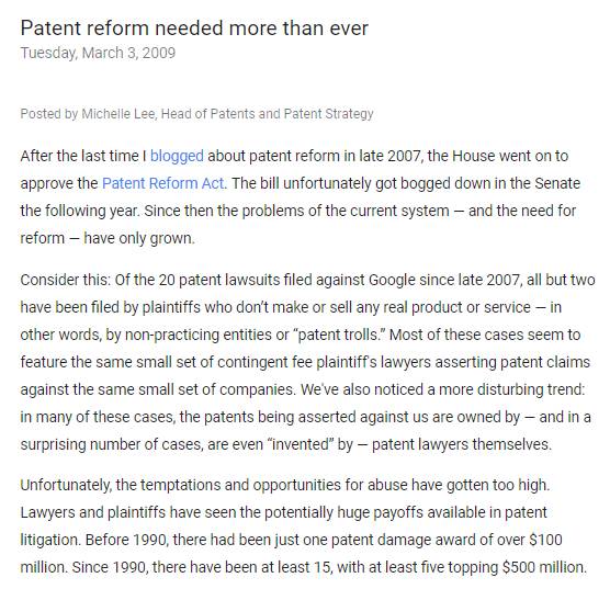 2003年-2012年,又是9年,从Google的in-house IP attorney,到全球专利战略负责人,然后是全球副法律总顾问(Deputy General Counsel)。2009年,时任Google全球专利战略负责人的Michelle Lee就曾发过博客,表示坚定拥护专利法改革,并抨击了专利流氓肆虐的现象,Lee说道:“(令人不安的是),攻击我们(Google)的一下专利其他有很多是专利律师们持有,甚至是自己“发明”的(the patents being asserted against us are owned by — and in a surprising number of cases, are even “invented” by — patent lawyers themselves)”。