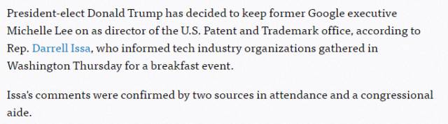 2017年1月,美国某国会议员Darrell Issa称,特朗普总统已经决定继续任命Michelle Lee作为美国专利商标局的局长。