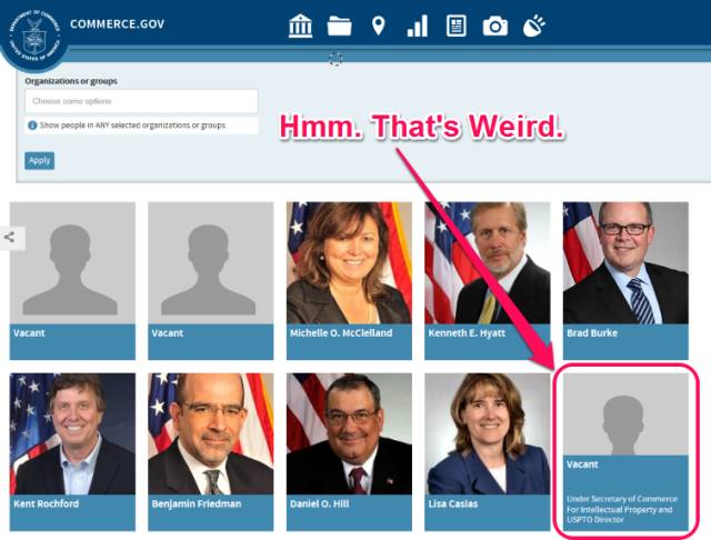 2017年2月,仅仅一个月之后,有媒体曝出美国商务局网站的截图(后被修改),图中显示USPTO的局长一职已经是空缺状态(Vacant),这个信号表示了特朗普其实已经在寻求其他人来替代Michelle Lee。不过,出尔反尔这种事情,相比于特朗普同学做出的其他的出格行为,应该不算啥吧。