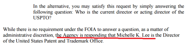 2017年3月,一个无聊的美国律师写信直接询问USPTO,要求专利商标局根据美国信息公开方案,回答到底谁才是现任的局长(Who is the current director or acting director of the USPTO? ),USPTO回复说目前仍然是Michelle K. Lee。 然而,同月,美国媒体却无情的曝出,美国商务部部长Wilbur Ross已经在面试接任Michelle Lee的候选人,除了Randall Rader之后,候选人名单中还有强生的前知识产权高级副总裁Philip Johnson,以及3M公司的CIPO首席知识产权官Kevin Rhodes。