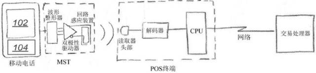其于2015年提出的申请号为CN201580000174.0的专利申请详细介绍了MST技术,使用安装在手机上的MST设备,将移动电话传送的包含支付卡磁条数据的脉冲流放大定形后,生成高能量磁脉冲,从而可以被远端的POS终端拾取来完成支付。