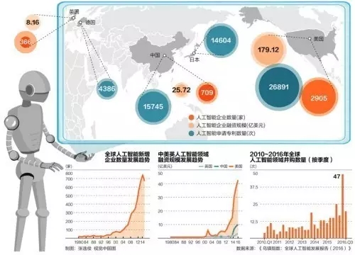更多 >>人工智能行业正在风起云涌。来自研究机构的分析报告称,2010年前,中国涉及人工智能及服务的企业不到20家,而去年这个数字已经飞速上升至709家。从资本市场的表现来看,截至2016年11月,全球范围内总计1485家与人工智能技术有关的公司,融资总额达到89亿美元。来自市场研究机构艾瑞咨询的数字则显示,未来5年我国人工智能市场的年复合增长率将达到50%。