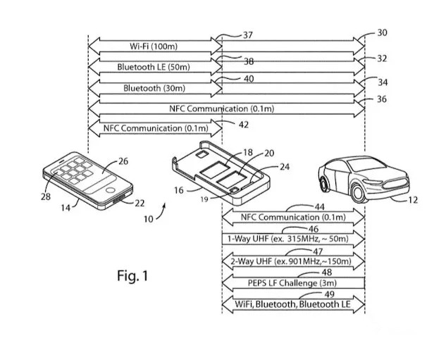更多 >>最近,福特获得了美国专利号为9,842,444的智能手机外壳专利,该外壳将成为汽车钥匙,集成了NFC通信功能以及UHF发射器和接收器的附加优点。此前,该专利由福特于2012年12月12日提交。