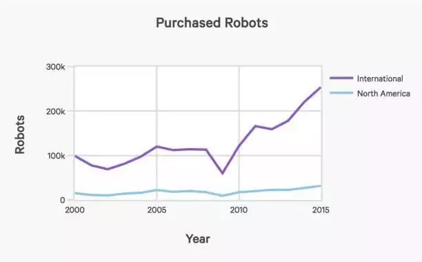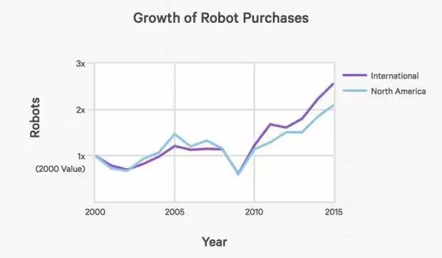再来看自动化应用的情况,下图展示了北美和全球工业机器人的购买以及购买增幅。工业机器人的使用正在增加。
