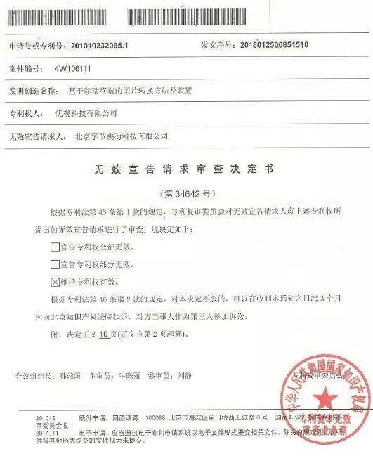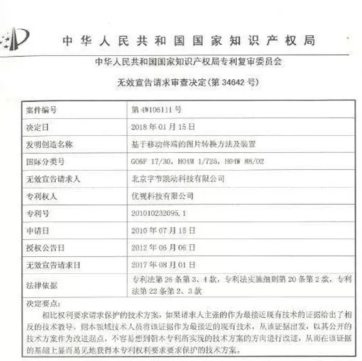 记者从UC了解到,2017年8月,今日头条针对这一专利向专利复审委员会提起无效请求,今天公布的结果,宣布该专利维持全部有效,今日头条的请求被驳回。按照法律程序,法院将继续专利侵权诉讼的审理。