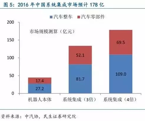 根据中汽协数据,2015年汽车整车、零部件制造业固定资产投资额分别为2724.16 亿、8685.49亿,若按整车及零部件行业机器人占固定资产投资额比值分别为1%、0.2%来估计机器人本体市场规模,并在此基础上估计系统集成市场规模,则2016年系统集成市场空间就已达134-178亿。