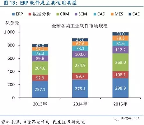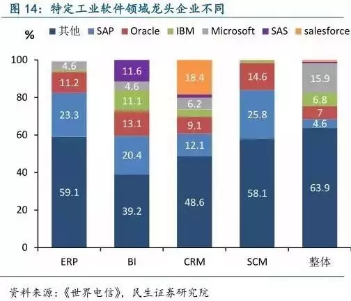 其中ERP软件产业格局相对稳定,SAP和Oracle两家企业占据主导,属于一线ERP软件,Infro、Sage、Microsoft隶属二线;在CRM领域中,Salesforce 占据全球CRM市场第一位,且发展迅速,其成功来自基于SaaS的云服务模式;